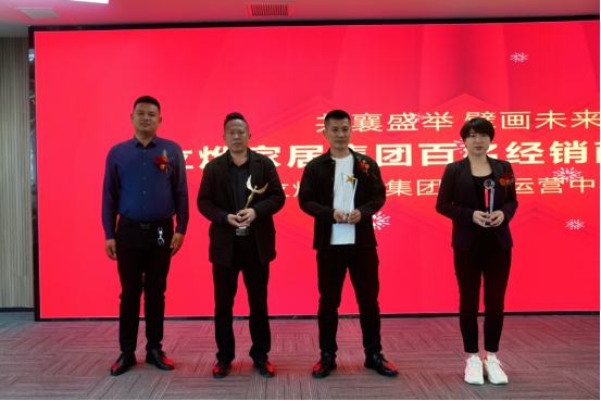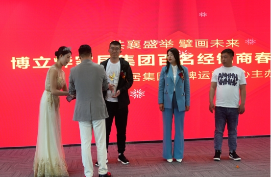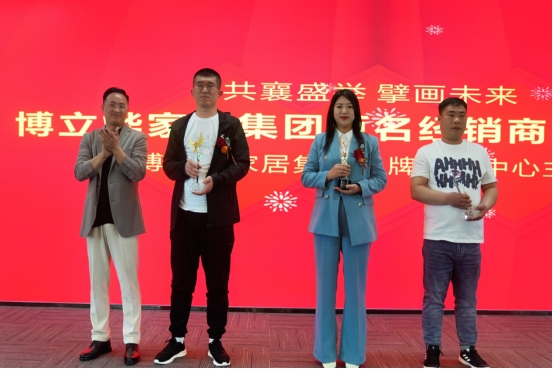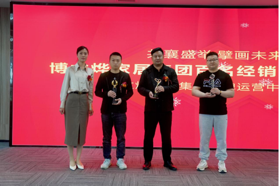 博立烨副总裁孙健为整装大家居的最佳贡献三位经销商——博立烨木门品牌王梁、女主人全屋定制刘云梦 、爱墨菲木门范志彬授予博立烨家居集团贡献奖