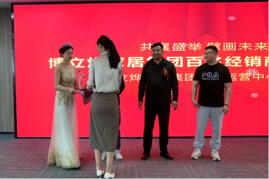 女主人创始人赵丽亲自为整装大家居合作精神最佳的三位——博立烨木门品牌许宝顺、女主人全屋定制刘孟军、爱墨菲木门赵文华授予博立烨家居集团团队奖